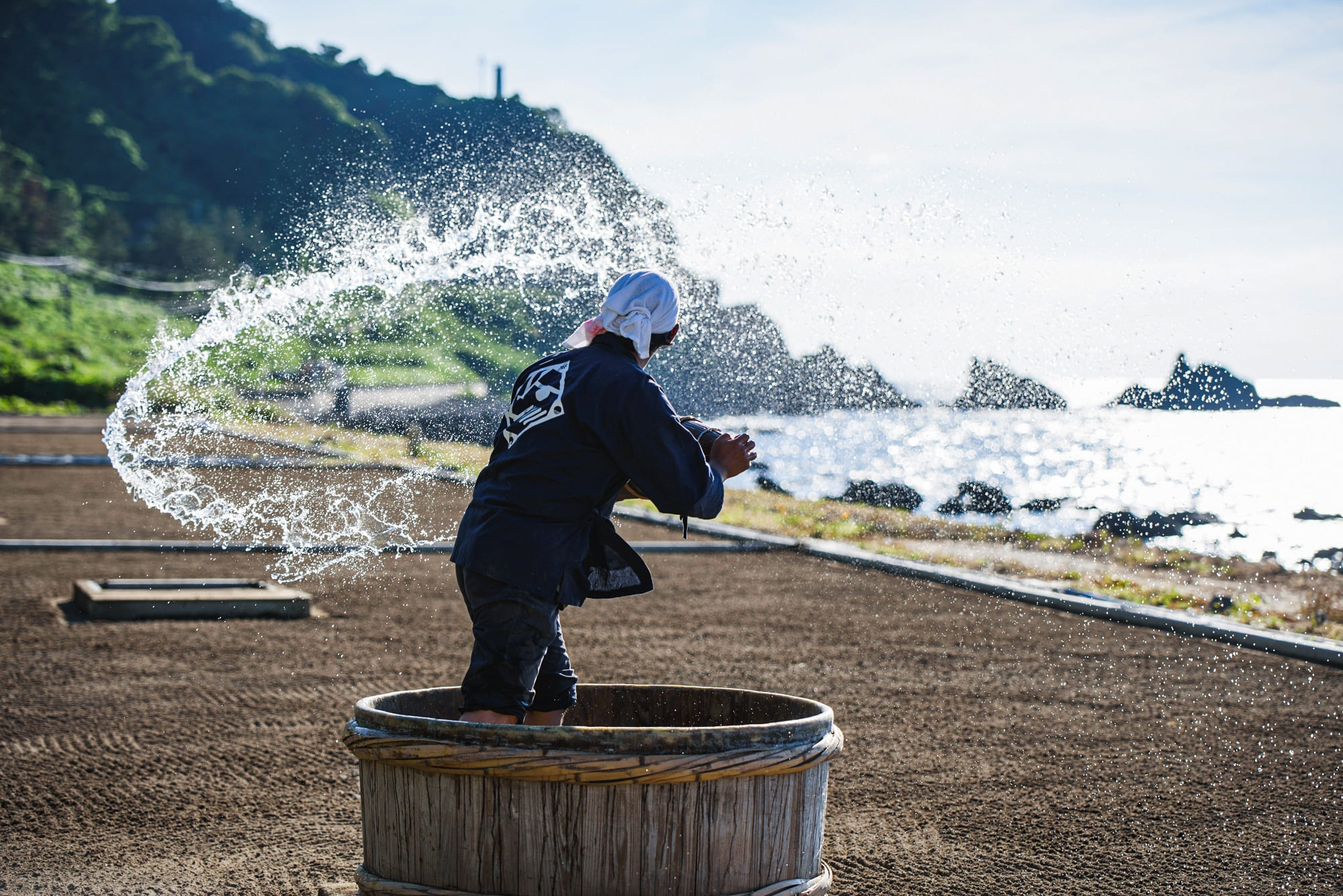 奥能登で500年間守り抜かれている天然の塩づくり、それが「揚げ浜式製塩法」です。美しい奥能登の海から海水を汲み、浜まで運び揚げ、塩田に広く均等に撒きます。天日でじっくりと乾燥させた砂を集め、さらに海水をかけて作るのが、塩分が凝縮した「かん水」です。これを大釜で、煮詰めに煮詰めて、塩の結晶を取り出します。奥能登の自然と人の手で丹精して生産されるのが、日本で唯一残る「揚げ浜塩」なのです。